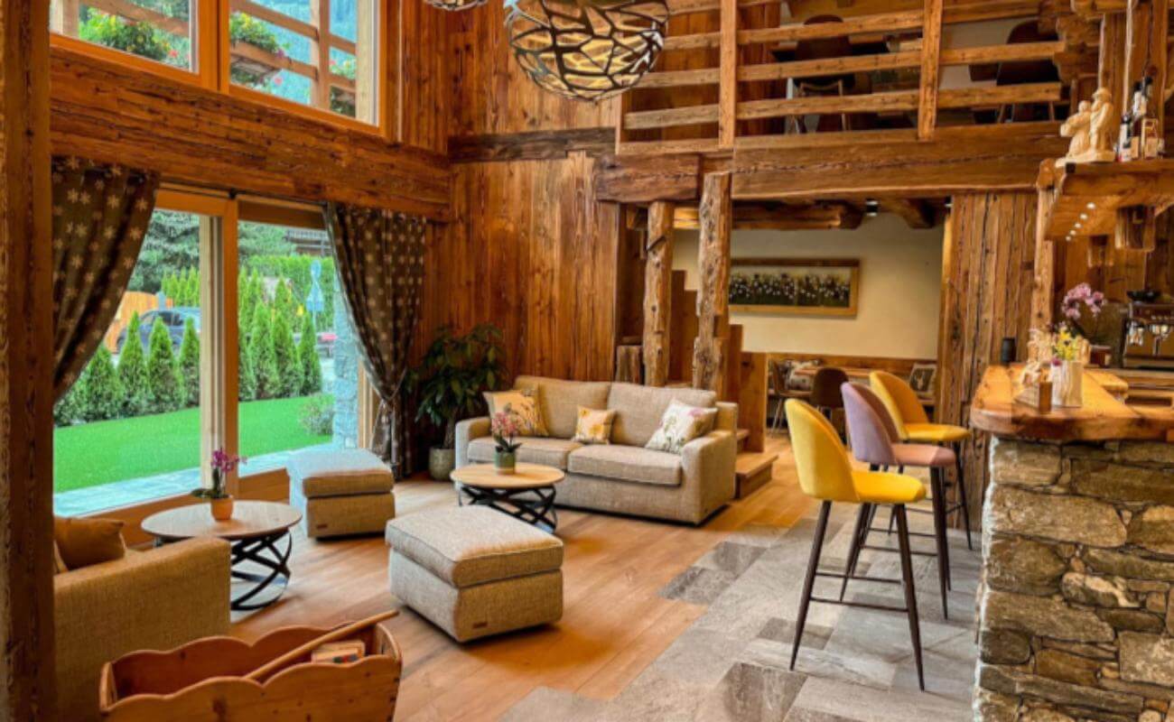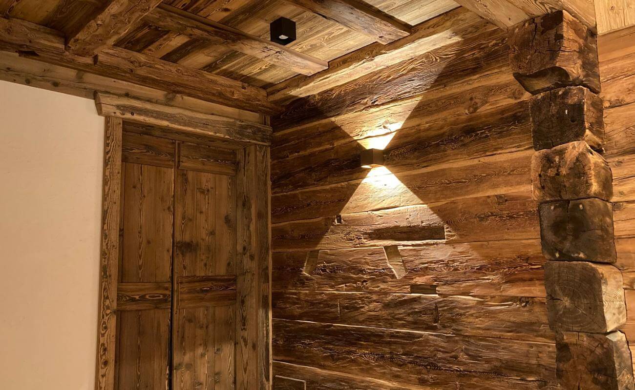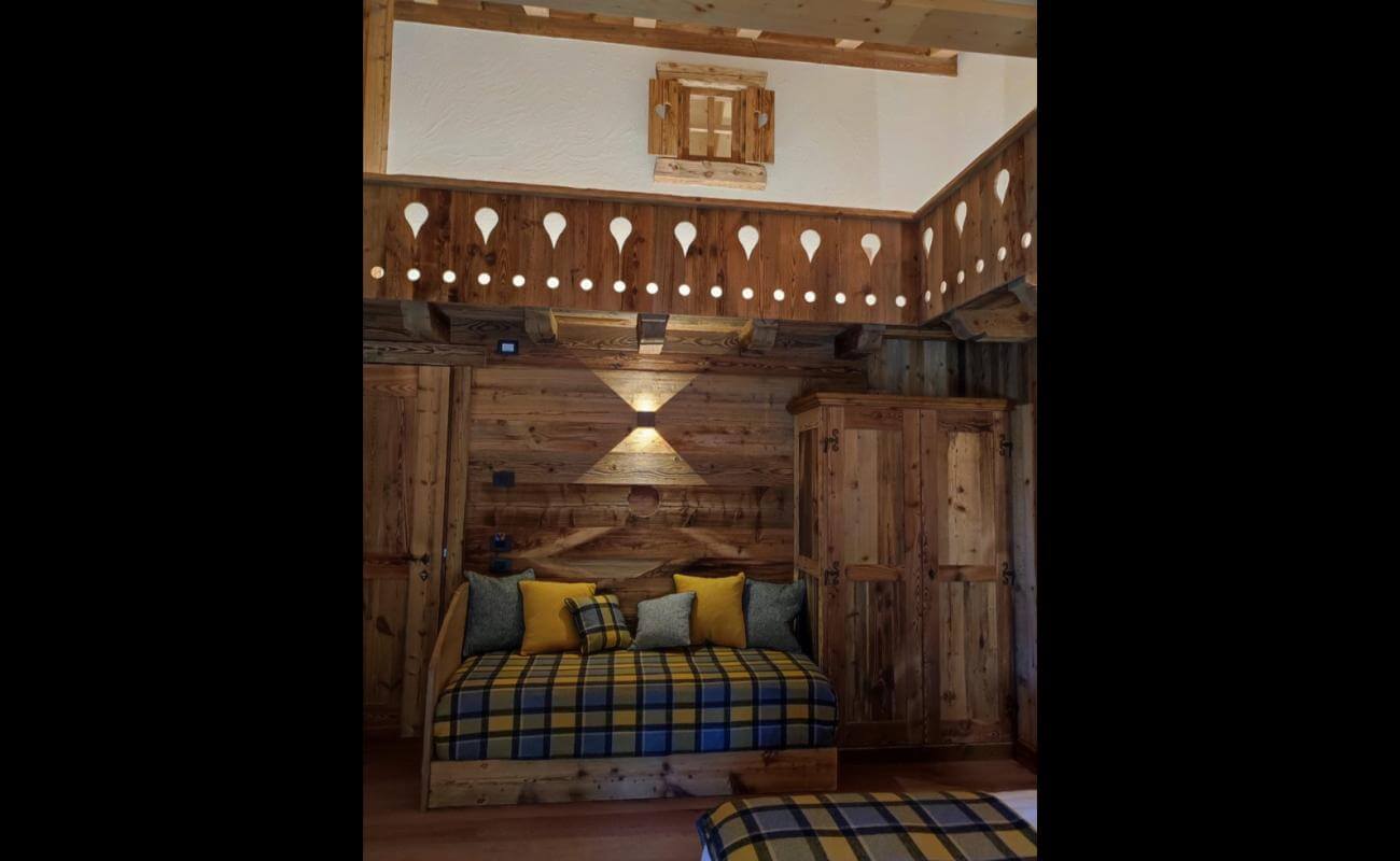 All'interno dell'edificio i proprietari hanno voluto ricreare le vie di un villaggio che si snodano attorno ad un fienile, luogo di aggregazione, circondato dai vecchi Stadel: edifici rurali dell'architettura walser, che poggiano su colonne a forma di fungo con gambo in legno e cappello di pietra (per isolare il fienile dall’umidità e dai roditori), la cui struttura è realizzata in tronchi di larice con incastri a croce.