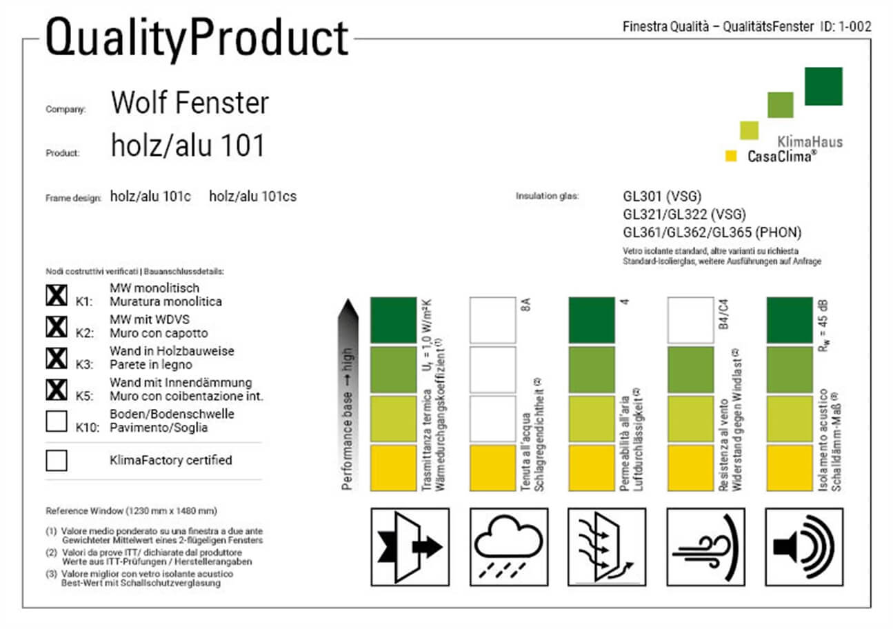 Serramento composto da telaio mobile in legno di spessore 84 mm e telaio fisso in legno di spessore 81 mm e di un rivestimento esterno in profilati di alluminio a giunto aperto. Profilo di tenuta a tripla battuta. Lo spessore totale dei battenti compreso il rivestimento in alluminio è di 101 mm. La finestra Wolf è certificata con il marchio RAL, che impone un severo controllo di qualità sia sui materiali che compongono le finestre, che sul processo di lavorazione.