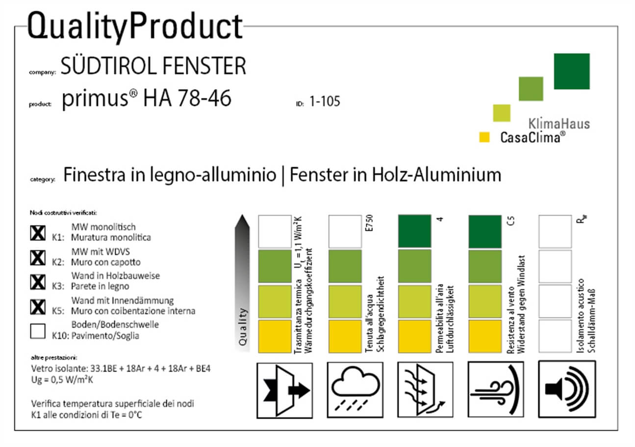 - triplo vetro isolante (Ug = 0,5 W/m²K) secondo la norma di sicurezza UNI 7697