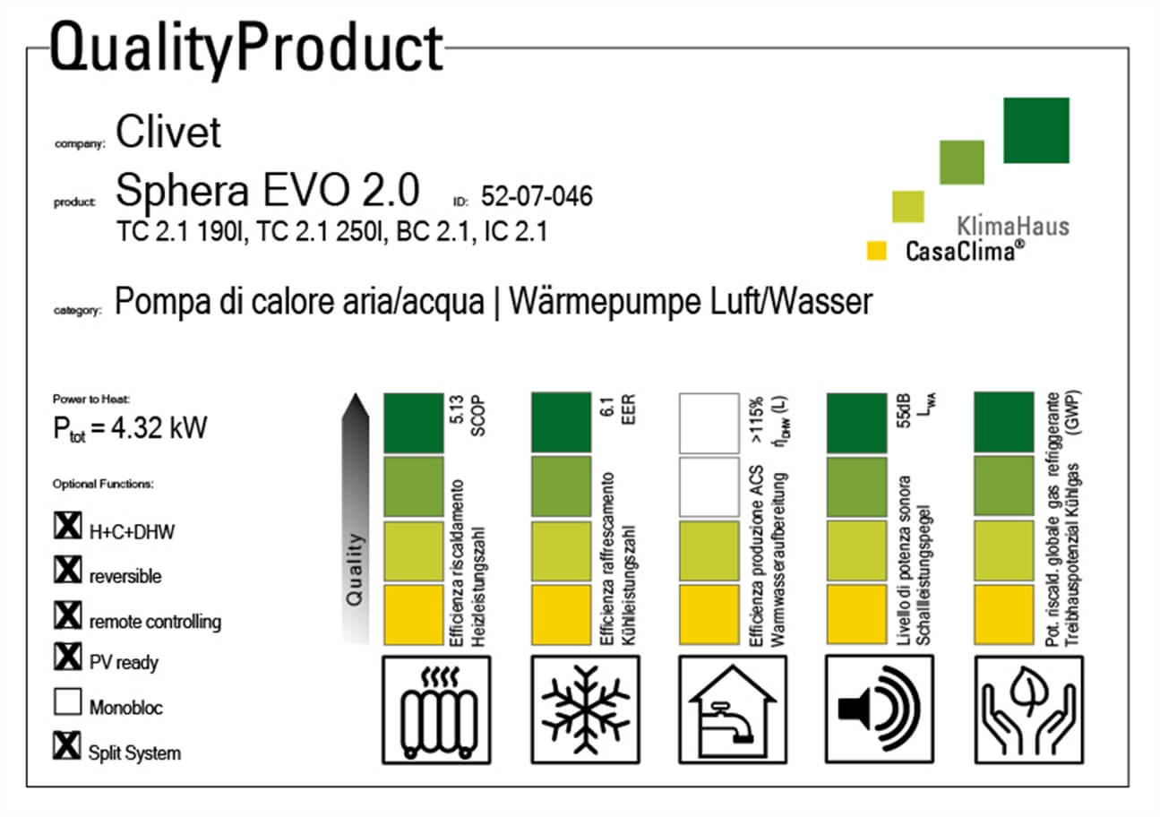 Pompa di calore in due sezioni con refrigerante R-32 e tecnologia inverter per riscaldamento, raffrescamento e produzione di acqua calda sanitaria, dotata di valvola a tre vie ACS integrata e possibilità di abbinare un accumulo della capacità desiderata da 190 o 250 litri.