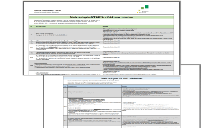Questa tabella riassume i principali requisiti del decreto del presidente della provincia n. 6 del 18.03.2025 per le costruzioni nuovi e di risanamento.